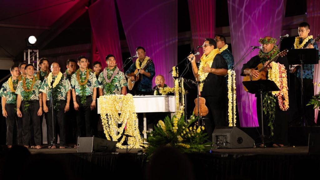 Photo: Kāhuli Leo Leʻa May Day 2025 celebration of Kumu Hula Robert Cazimero’s legacy with Hālau Nā Kamalei O Līlīlehua. Photo credit: ʻŌiwi TV.