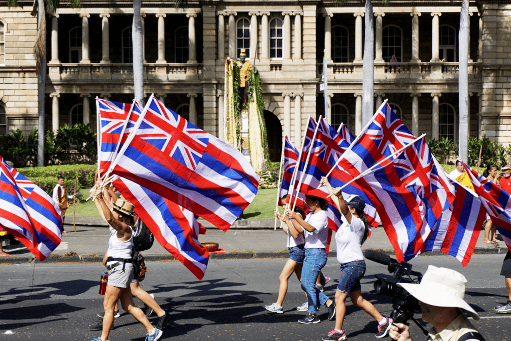 Photo at top of page: Hawaiian flags held high during a King Kamehameha Celebration Floral Parade. Photo credit: King Kamehameha Celebration Commission.