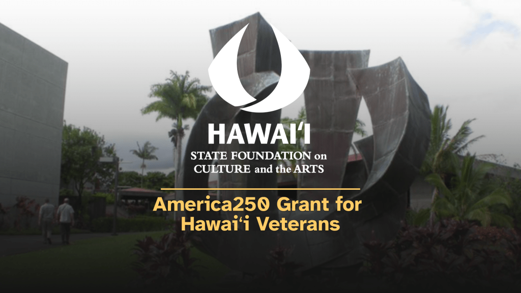 The project must celebrate America 250 through arts-based projects or programs directly focused on Hawaiʻi veterans. All project activities must be implemented in the State of Hawaiʻi. Proposals can include activities that honor veterans or improve the health and well-being of military and veteran communities. Examples of possible projects are arts and healing programs, visual arts, StoryCorps, spoken word, film, exhibition, performance, historical/heritage interpretations, and living history projects. Eligible entities are nonprofit 501(c)(3): arts organizations, cultural organizations, and community service organizations. Veteran and military service organizations are also eligible. Eligible organizations must be incorporated in the State of Hawaiʻi. This is a single $25,000 grant award.