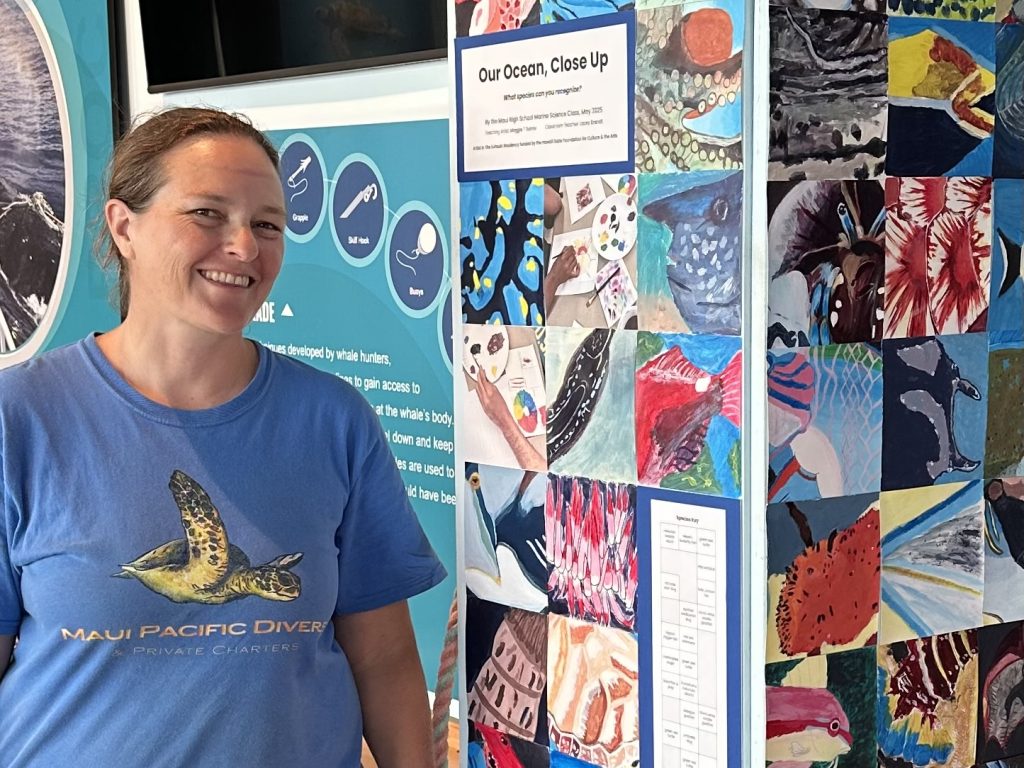 Maggie reports: “Close to 100 paintings of marine life by Maui High School students are on display at the Hawaiian Islands Humpback Whale National Marine Sanctuary in Kihei, Maui. Students worked as both scientists and artists to communicate the value of Hawaiʻi’s ocean ecosystem. For the exhibit, “Our Ocean, Close-Up,” students chose a species found in Hawaiʻi’s waters and sourced a high-resolution image of it. They then zoomed into the images to choose a composition that highlights details both beautiful and important to the species. After practicing color mixing with acrylic paint, students created their paintings. Students talked about how we care about what we know, and hopefully these paintings will help more people see and appreciate the wonder of our ocean species. Come see how many species you can recognize from the close-up paintings!